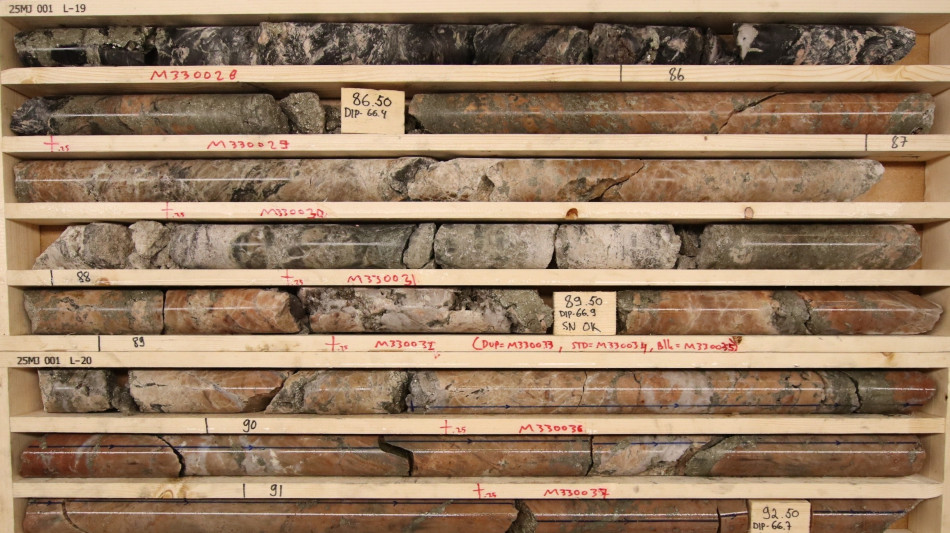 25MJ004 stepped back a further 66 metres behind 25MJ003, and it intersected the contact between the volcanics and metasediment units at 155.4 metres downhole. A high-grade gold mineralized interval of 4.0 metres averaging 18.4 g/t Au started at 178.0 metres downhole, including 1.0 metres at 40.3 g/t Au. This interval was related to strongly altered metasediments with abundant pyrite mineralization.