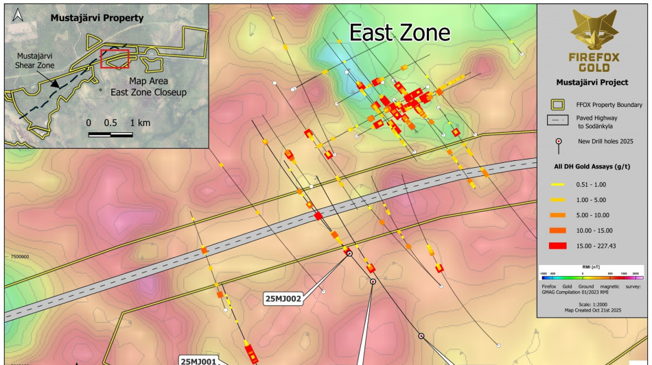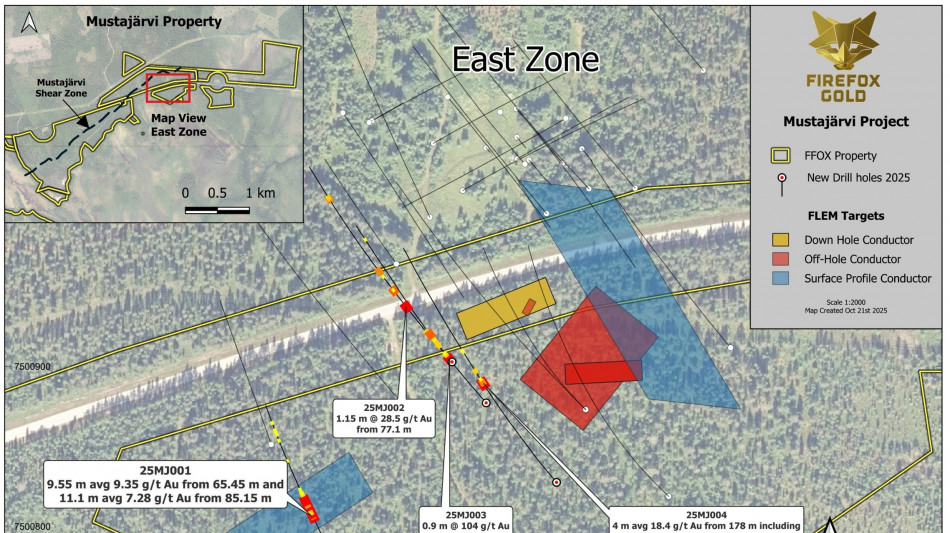 SODANKYLÄ, FINLAND / ACCESS Newswire / October 27, 2025 / FireFox Gold Corp. (TSX.V:FFOX)(OTCQB:FFOXF)("FireFox" or the "Company") is pleased to report the results from the first four holes of its 2025/26 diamond drilling program at the Company's 100%-held Mustajärvi Gold Project in Lapland, Finland. One of the key early goals of the drill program was to test targets identified in the fixed loop electro-magnetic (FLEM) geophysical surveys from earlier this year. Drill hole 25MJ001 tested one of these interpreted conductors, located nearly 280 metres southwest from the centre of the East Zone (See Figure 1). The hole penetrated a thick interval of strong gold mineralization associated with abundant pyrite including: