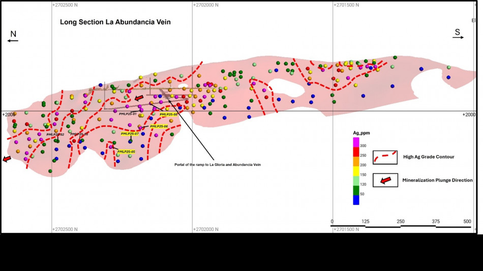 Hole PMLP 25-08 at Abundancia: 463 g/t Ag and 0.61 g/t Au over 4.00 metres true width