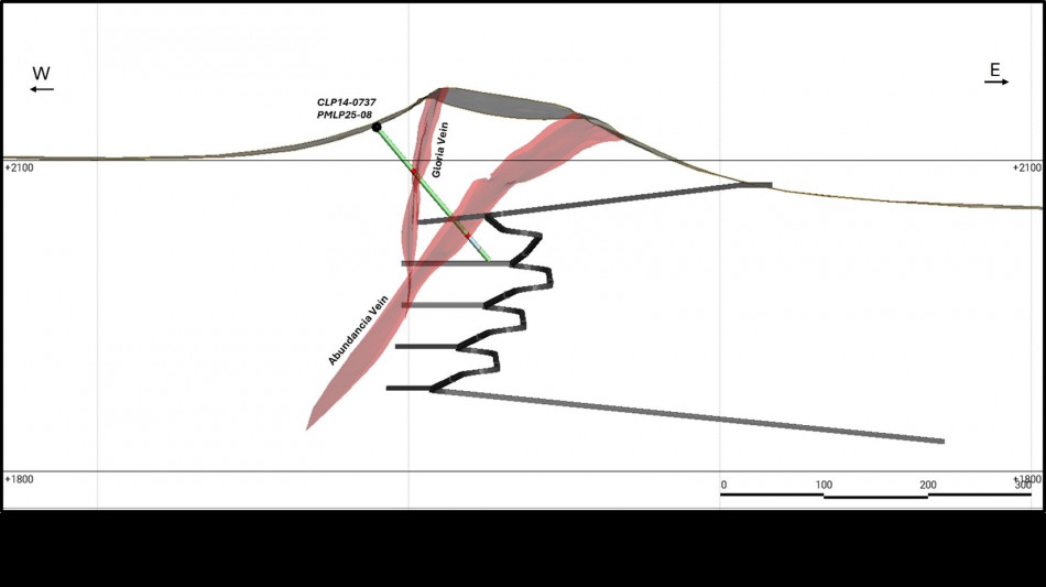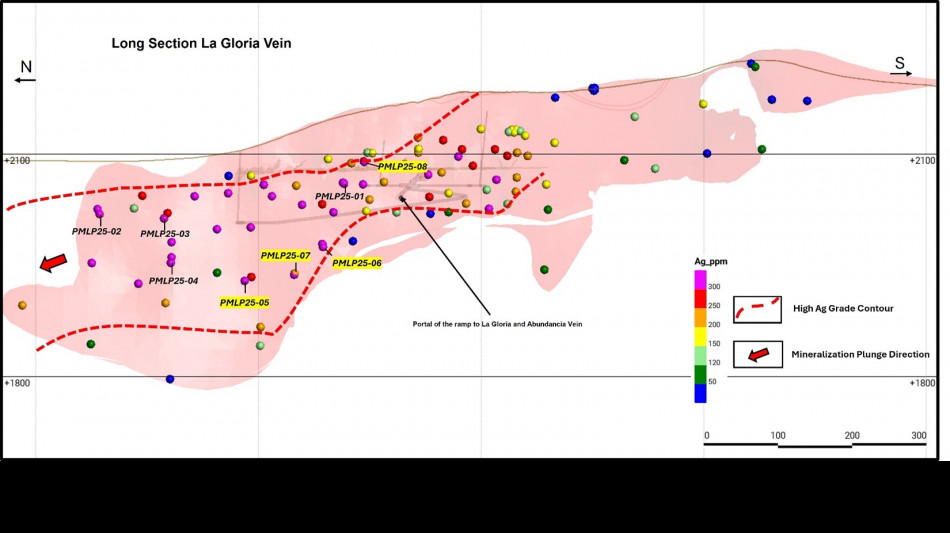 Hole PMLP 25-08 at Gloria: 306 g/t Ag and 1.15 g/t Au over 3.98 metres true width