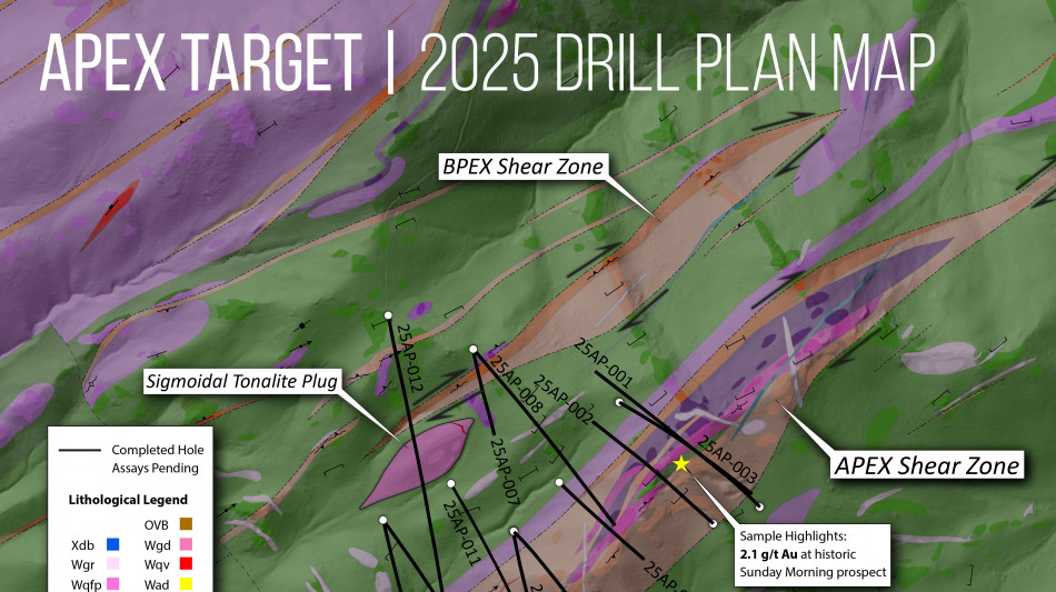 Figure 1. Plan View map of 2025 Apex shear drill holes (25AP-001 through 25AP-012) along with the newly identified BPEX shear zone and the sigmoidal tonalite intrusive body. Drill holes shown as downhole drill trace projected to surface. Samples indicated on the figure are from 2024 rock chip sampling by the Company (see news release). View larger image here.