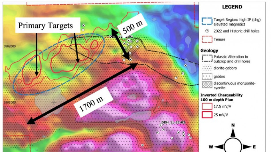 "Our technical team, which includes Equity Exploration Consultants Ltd., Members of the Board and our Technical Advisory Committee have done an exceptional job integrating decades of historic data," stated Len Brownlie, Ph.D., CEO of Prospect Ridge. "Very recently, an inversion of aerial magnetics data has revealed compelling signatures showing elevated magnetic features coincident with areas of elevated chargeability from an earlier IP survey. These inverted magnetic features at depth are consistent with potential apophyses on the shoulder of a larger batholith and are hypothesized to represent a porphyry stockwith disseminated sulphides and magnetite. Supporting this hypothesis, a historic 1974 vertical percussion hole (PDH74-L04), drilled to just 61metres depth, intersected 0.25% copper over 21.3 metres within a potassic-altered biotite monzonitei that appears to have clipped the outer flank of this hypothesized stock. With over $2.8M in our treasury, all permits in place and drilling set to begin on November 1, we are very excited to test these newly characterized targets".