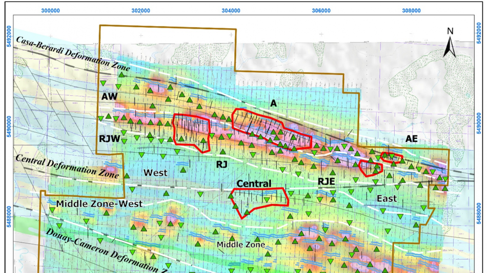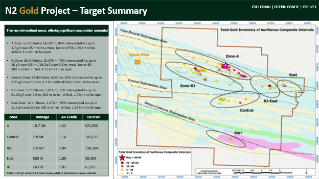 The drilling at N2, which is host to a global historic resource of ~870,000 ounces comprised of 18 Mt grading 1.4 g/t Au (~809,000 oz Au) across four zones (A, East, RJ-East, and Central)2,3 and 243 Kt grading 7.82 g/t Au (~61,000 oz Au) across the RJ zone2, is designed to focus on discovery drilling at new high-potential targets along the mineralization strikes at the "A", "RJ" and "Central" zones in the northern part of the Property in order to discover new auriferous trends and unlock new zones of gold mineralization. The program will also focus on high-priority infilling and expansion targets in these zones to significantly enhance the auriferous zones identified to-date.