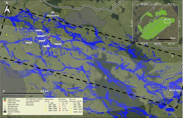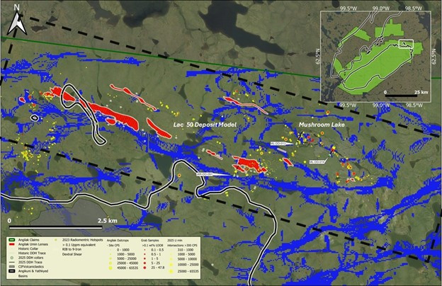 Cliff Revering, VP Exploration added: "The 2025 Angilak exploration program was designed with two core objectives: expanding the mineralization footprint at the Lac 50 deposit and advancing two high-priority regional targets - KU and RIB - located along the RIB-Nine Iron Trend. The program not only met these objectives but also exceeded expectations, yielding multiple new discoveries at both KU and RIB. A key highlight was the identification of a 12 km-long structural corridor associated with uranium mineralization, anchored by the significant new discovery at RIB North.