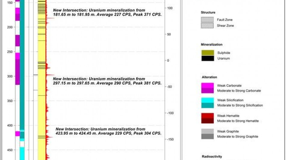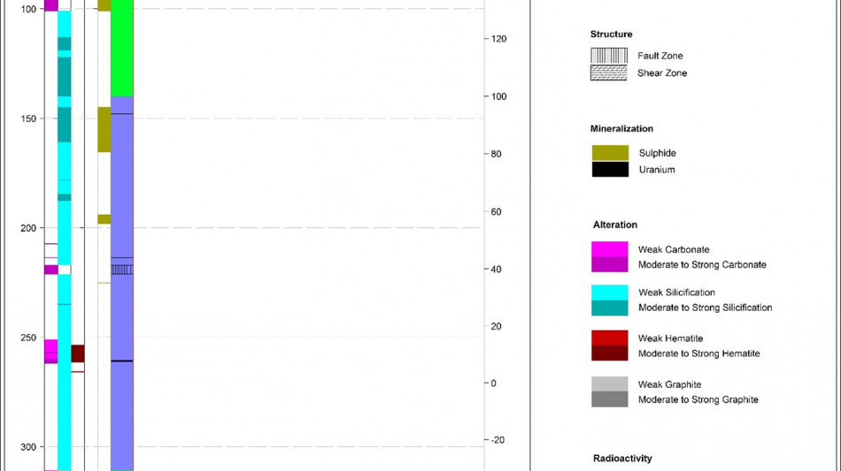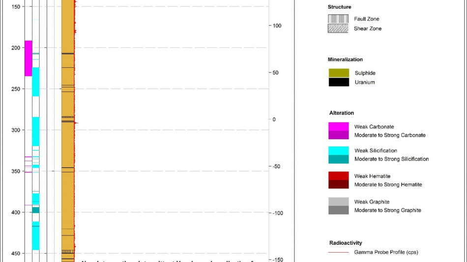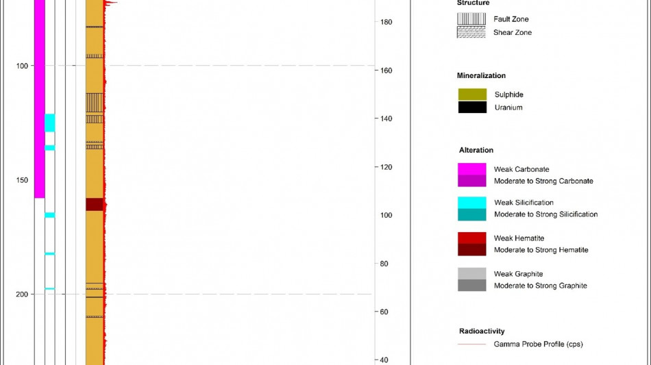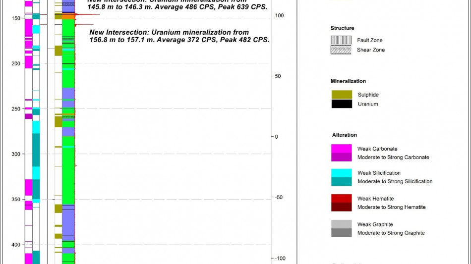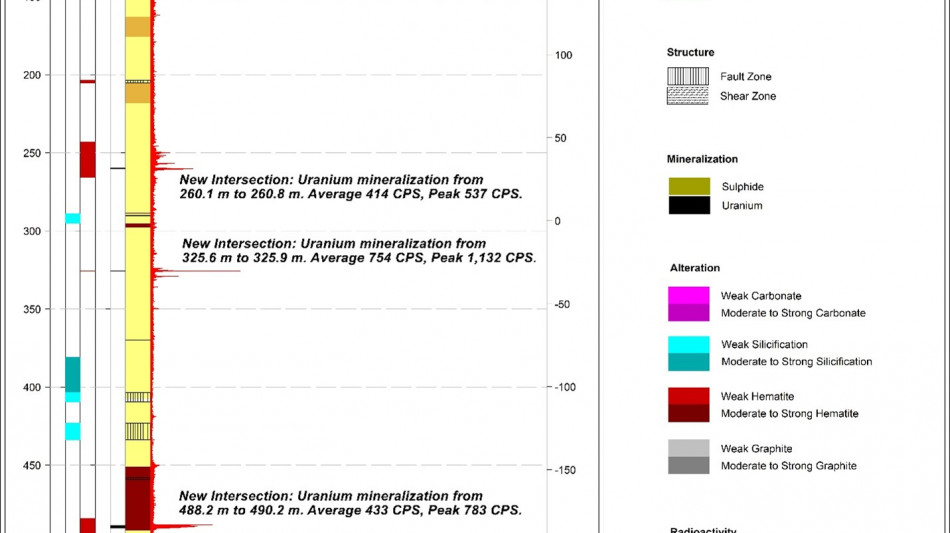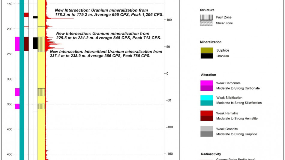 2 The Company considers high-grade mineralization to be any interval with radioactivity derived from downhole gamma probe >10,000 CPS. The total gamma results provided were selected using an average cutoff of 500 CPS over intervals of 0.1 metre width. All drill intercepts are core width and true thickness is yet to be determined.