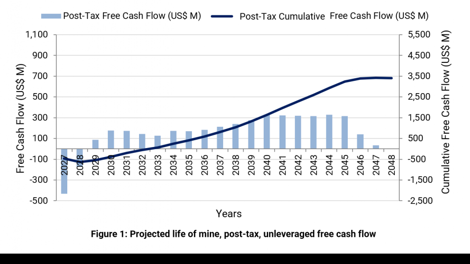 Figure 1 demonstrates the yearly and cumulative post-tax free cash flow generated through the LOM.