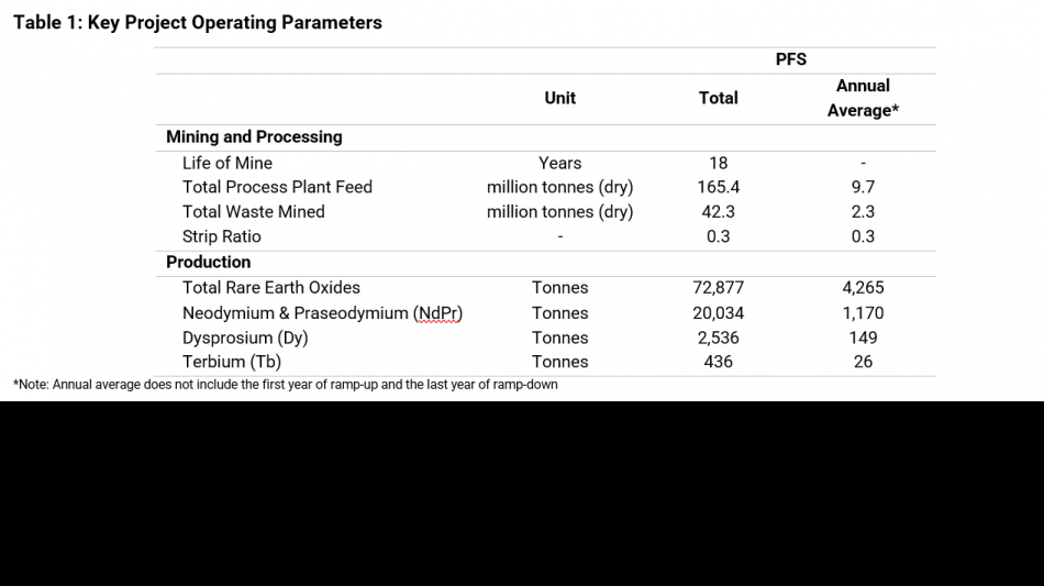 Table 1 and Table 2 summarize the relevant parameters associated with the PFS operating and financial metrics: