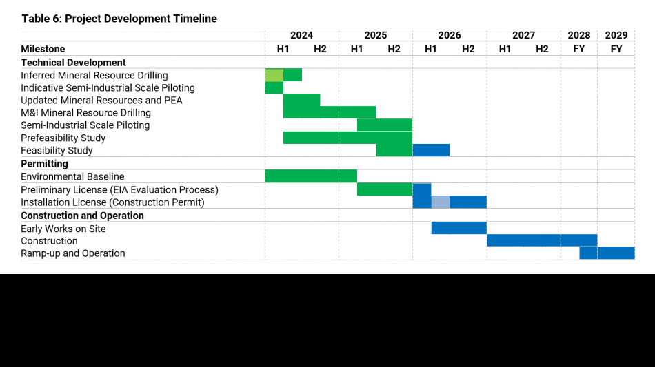 The permitting process is currently underway and the technical development is in progress with a feasibility study scheduled to be delivered in Q2 2026 and commencement of operations projected to begin at the end of 2028 (Table 6). The Company is evaluating the possibility to expedite the production schedule to begin by mid-2028.