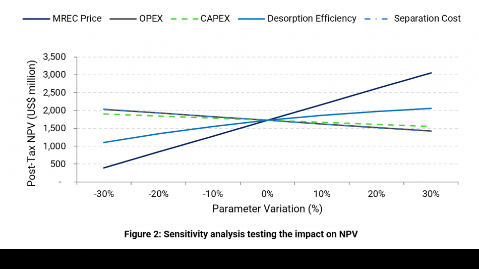 A sensitivity analysis was undertaken to evaluate the impact on after-tax NPV, considering a variation of ±30% for five key input variables: MREC sale price, Separation Cost, Desorption Efficiency, OPEX and CAPEX (Figure 2).