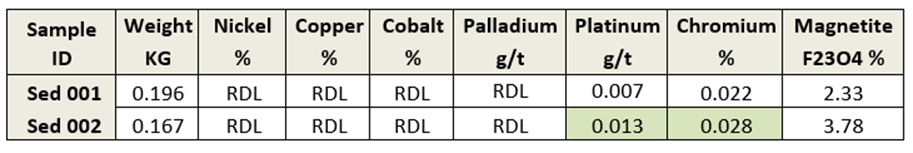 The presence of sulfide rich rocks outside the previous zone of interest prompted the team to extend sampling and collect stream sediment samples approximately 3.5 km further east to investigate the potential for prospection of that area. One of the stream sediment samples may indicate a potential upstream anomaly as it detected trace platinum values of 0.013 g/t Platinum, while palladium was below detection limits These results could point out to a distal PGE dispersion plume.