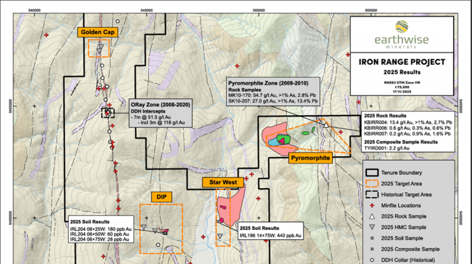 VANCOUVER, BC / ACCESS Newswire / November 17, 2025 / Earthwise Minerals Corp. (CSE:WISE)(FSE:966) ("Earthwise" or the "Company") is pleased to announce that it has received results from 2025 fieldwork with samples grading up to 13.4 g/t Au, 27.2 g/t Ag, > 10,000 ppm As, and 2.7% Pb. Earthwise holds the exclusive option to acquire up to an 80% interest in the Iron Range Project from Eagle Plains Resources Ltd. (TSX-V:EPL)(OTCQB:EGPLF) ("EPL" or "Eagle Plains").