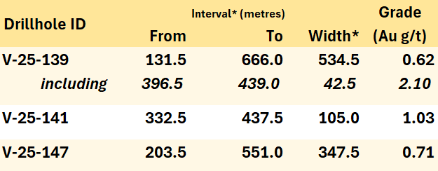 Open, consistent mineralization on Valley's margins, including V-25-139 with 534.5 m @ 0.62 g/t Au (incl. 42.5 m @ 2.10 g/t Au), and 10 of 12 reported holes ending in mineralization