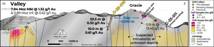 "We are also excited by the pictures taking shape on several regional targets. At Gracie, for example, 4 km east of Valley, drill hole G-25-010 intersected a 53.5 m wide zone of RIRGS mineralization in silicified sediments along a northwest structural corridor - broadly similar to what we saw in V-21-004 on our very first drill program at Valley four years ago. This year's second hole at Gracie, G-25-011, hit large intersections of intrusive rock for the first time on the target: two intrusive phases similar to units at Valley which we interpret as important hosts to and drivers of gold emplacement. These are key developments in vectoring towards what we think could be a significant gold system near our flagship deposit."
