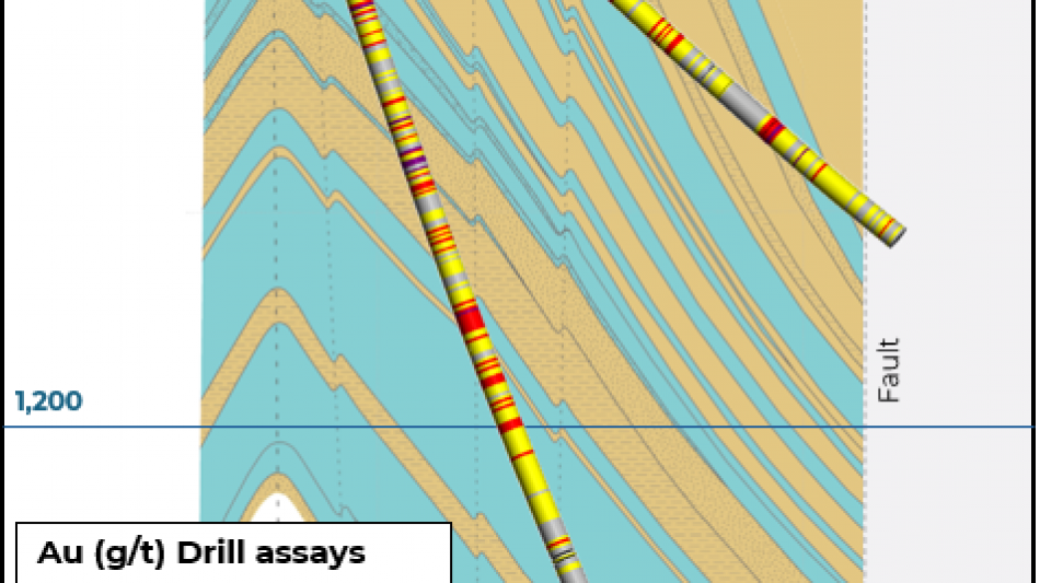 Two drillholes were collared 200 m to the southeast of the chip sample to target the gold anomaly located along the northeastern limb of the anticline. The drillholes intercepted interbedded siliciclastic and calcareous siltstone beds with mudstone, sandstone and conglomerate interbeds and returned several intervals greater than 0.1 g/t Au with up to 0.392 g/t Au in NEP-25-001 (Table 3). The mineralized intervals are characterized by disseminated pyrite with variable graphite content and quartz-carbonate veinlets with pyrite and graphite aggregates. These results extend the anomaly identified at Neptune by more than 200 m of strike length, demonstrate a vertical continuity greater than 500 m between the chip samples and drill core intercepts.
