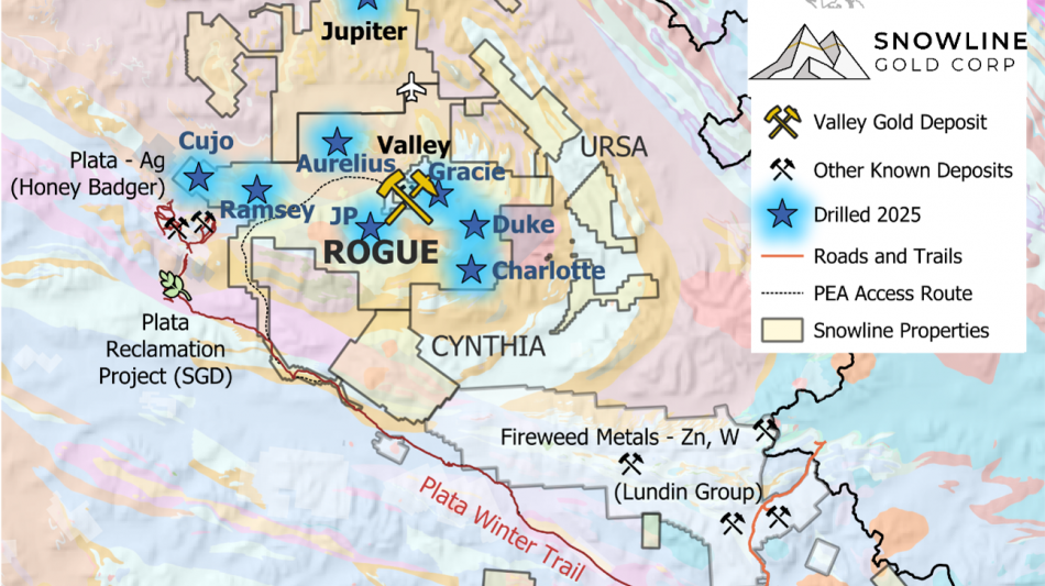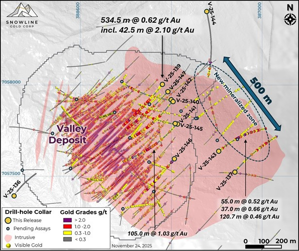 VANCOUVER, BC / ACCESS Newswire / November 24, 2025 / SNOWLINE GOLD CORP. (TSX-V:SGD)(OTCQB:SNWGF) (the "Company" or "Snowline") is pleased to announce additional drill results from its Rogue and Einarson projects in the eastern Yukon Territory. Drilling at Snowline's flagship Valley gold deposit ("Valley") on the Rogue Project continues to confirm and expand the scale of known mineralization, with initial assays from a new zone that is developing near the eastern margin of the Valley intrusion returning ling intersections of anomalous gold across a broad area (Figure 1). At the Rogue Project's Gracie target ("Gracie"), two intervals of mineralization in G-25-010-along with intrusive rocks in G-25-011 (assays pending)-provide further evidence of the causative reduced intrusion-related gold system ("RIRGS") and its potential location. Initial drill results from additional regional targets demonstrate additional mineralized intersections. Assays are pending on additional holes, with approximately 13,700 m of drill results from Snowline's 2025 season still to be reported.