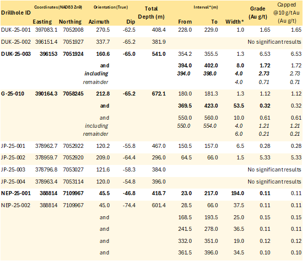 Preliminary drilling of one such breccia returned 8.0 m averaging 1.72 g/t Au from 394.0 m downhole, including 4.0 m at 2.73 g/t Au, in hole DUK-25-003. Roughly 600 m northeast of the collar site, surface sampling of breccia units has yielded selective grab samples of up to 8.0 g/t Au.