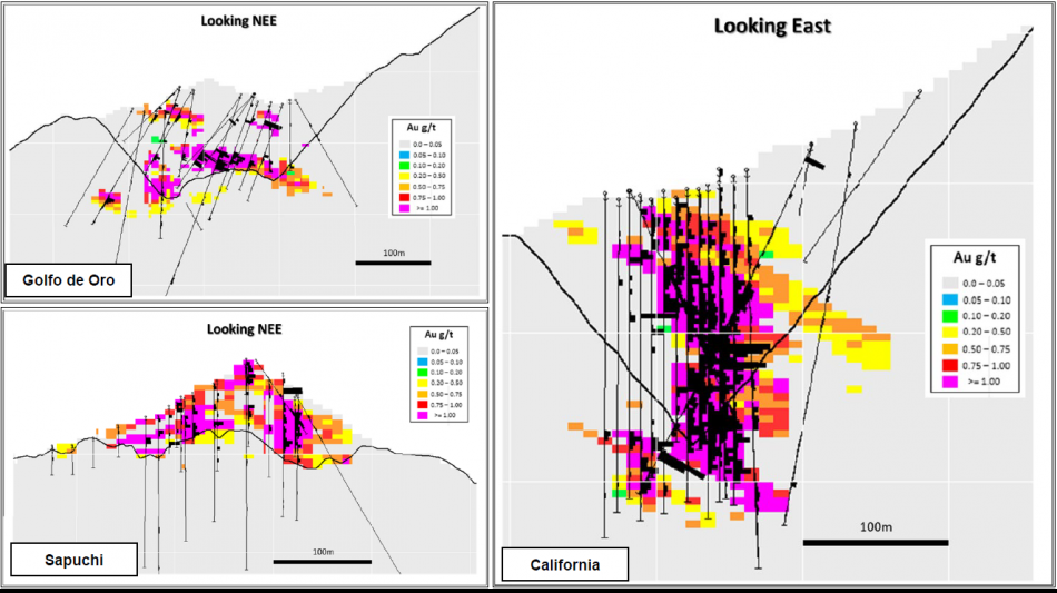 Initial open-pit mineral resource estimate ("MRE") (effective June 24, 2022) totaled 576koz of gold in the indicated category and 544koz of gold in the inferred category, encompassing five deposits (Sapuchi, Golfo de Oro, California, Calvario, and High Life) along a 2.8 km strike length. The MRE is underpinned by a robust database of approximately 85,000 m of drilling inclusive of a +27,000 m drill campaign conducted in 2021. Over 90% of the contained resource metal is hosted in the Golfo de Oro, California and Sapuchi deposits.