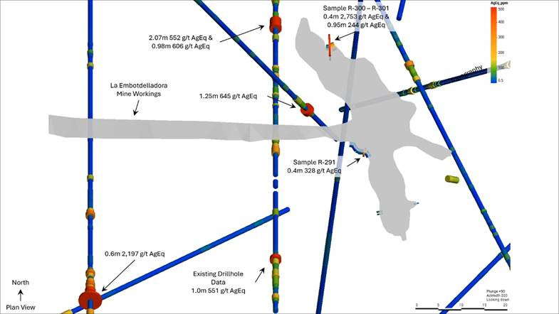 A total of 16 channel samples were collected from the historic La Embotelladora mine workings, showing mineralization localized in ENE and NNE structural zones. Sample R-300 returned 2,753 grams per tonne (g/t) silver equivalent (AgEq) over 0.4 metres (m) representing the NNE trending zone. Sample R-291 returned 328 g/t AgEq over 0.4m representing the ENE structural zone (Table 1). These data combined with existing drilling results are aiding in the Company's ongoing strategy of transitioning La Joya from an open pit to an underground project by confirming high grade mineralization localization in a network of prospective structures. Ongoing geologic modeling will focus on validating this thesis through re-focused exploration planning.