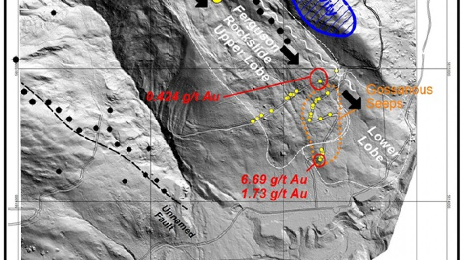 Taranis Samples up to 6.7 g/t Gold in Gossanous Seeps Underneath Ferguson Rockslide, 2 km Southeast of Southernmost NI 43-101 Mineralization at Thor