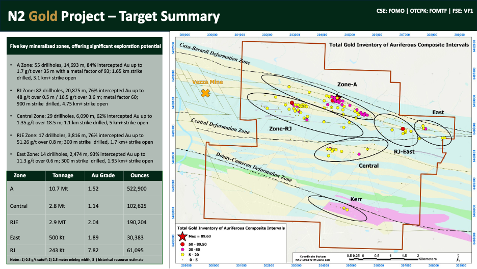 Formation Metals Inc. is a North American mineral acquisition and exploration company focused on the development of quality properties that are drill-ready with high-upside and expansion potential. Formation's flagship asset is the N2 Gold Project, an advanced gold project with a global historic resource of ~870,000 ounces (18 Mt grading 1.4 g/t Au (~810,000 oz Au) across four zones (A, East, RJ-East, and Central)2,3 and 243 Kt grading 7.82 g/t Au (~61,000 oz Au) across the RJ zone2,4) and six mineralized zones, each open for expansion along strike and at depth including the "A" zone, of which only ~35% of strike has been drilled (>3.1 km open), and the "RJ" zone, host to historical high-grade intercepts as high as 51 g/t Au over 0.8 metres.