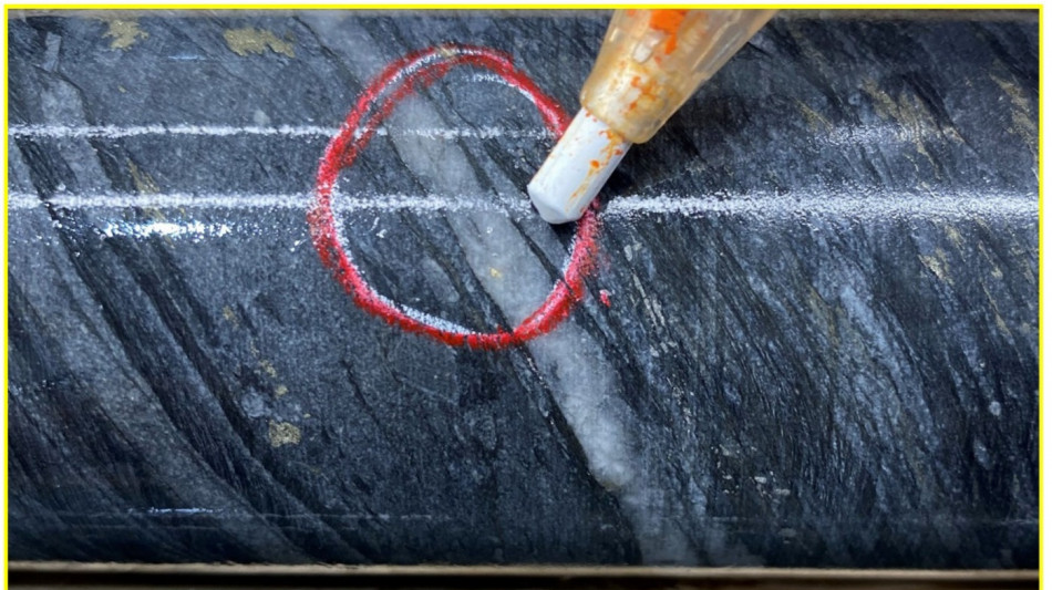 Drill hole N2-25-001: Visible gold was intercepted within a 4.5 metre pyrite mineralized interval associated with quartz-carbonate veining typical of the historical mineralization identified.