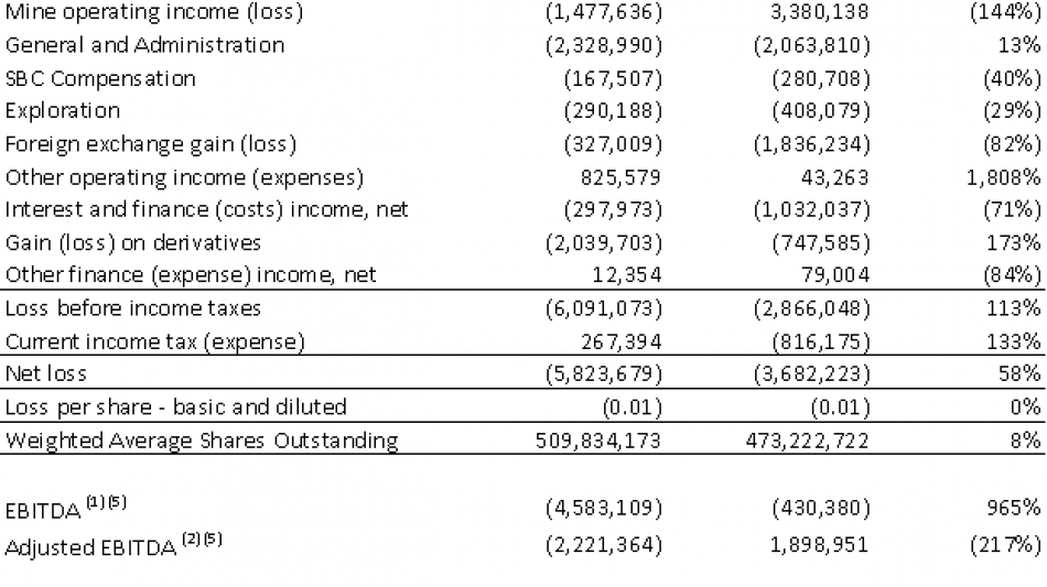 The financial results were as follows for the three months ended September 30, 2025 and June 30, 2025. The Company notes that 44% of the net loss consists of non-cash items, including foreign exchange loss, share-based compensation, and loss on derivatives stemming from the Company's sole outstanding loan.