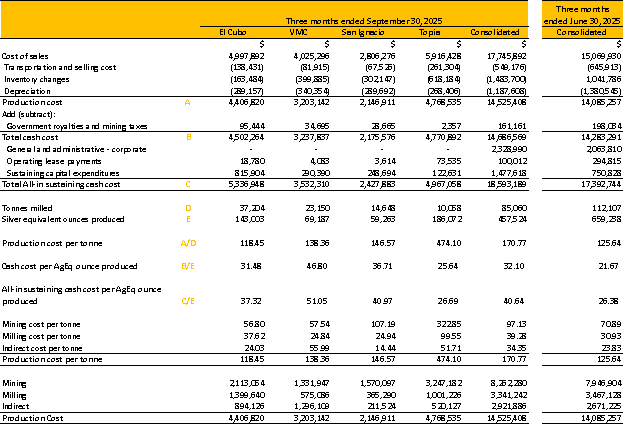 Silver equivalents are calculated using 87.70:1 (Ag/Au), 0.02:1 (Ag/Pb) and 0.03:1 (Ag/Zn) ratio for Q3 2025; an 84.04:1 (Ag/Au), 0.03:1 (Ag/Pb) and 0.04:1 (Ag/Zn) ratio for Q3 2024, respectively.