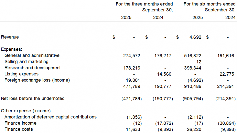For the three-month and six-month periods ended September 30, 2025, the summary of the financial results are as follows: