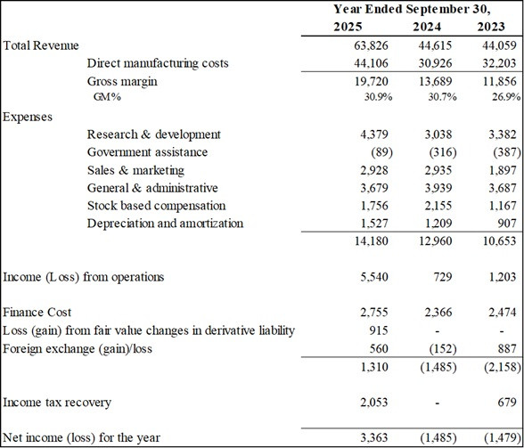 This press release contains forward-looking statements, including statements that relate to, among other things, revenue, purchase orders, revenue guidance of more than 30% revenue growth (exceeding $83 million) over FY 2025 in FY 2026, order growth and customer demand in FY 2026, mass production schedules, , the Company's ability to start production of cells at the Jamestown, New York facility by end of CY 2026, future business opportunities, use of proceeds, ability to deliver to customer requirements and revenue growth forecasts for the fiscal year ending September 30, 2026. Forward-looking statements can generally, but not always, be identified by the use of words such as "may", "will", "could", "should", "would", "likely", "possible", "expect", "intend", "estimate", "anticipate", "believe", "plan", "objective" and "continue" (or the negative thereof) and words and expressions of similar import. Although the Company believes that the expectations reflected in such forward-looking statements are reasonable, assumptions and analyses made by the Company in light of the experience and perception of historical trends, current conditions and expected future developments and other factors it believes are appropriate are necessarily applied in making forward looking statements and such statements are subject to risks and uncertainties, therefore actual results may differ materially from those expressed or implied in such statements and undue reliance should not be placed on such statements. Material assumptions made in disclosing the forward-looking statements included in the news release include, but are not limited to assumptions that the Company's customers will deploy its products in accordance with communicated timing and volumes, that the Company's customers will complete new distribution centers in accordance with communicated expectations, intentions and plans, the sum of anticipated new orders in FY 2026 based on customers' historical patterns and additional demand communicated to the Company and its partners but not yet provided as a purchase order with the Company's current firm purchase order backlog totaling approximately $100-125 million, a discount of approximately 25% used in the revenue modeling applied to the overall expected order pipeline to account for potential delays in customer orders, expected decreases in input and material costs combined with stable selling prices in FY 2026, and a stable political climate with respect to exports from Canada to the United States, the start up time for manufacturing in Jamestown NY is estimated towards the end of FY 2026 or first quarter of FY 2027, the ability to leverage IRA45X credits, the ability to receive incentives from the state of New York, the ability to improve margins from domestic manufacturing, and the ability to attract additional customers through domestic manufacturing. Factors that could cause actual results to differ materially from expectations include but are not limited to customers not placing orders roughly in accordance with historical ordering patterns and communicated intentions resulting in annual revenue growth in FY 2026 of more than 30% over FY 2025 (exceeding $83 million), the predictability of sales and success of the Company's products in verticals other than material handling, the imposition of a tariff regime on Canadian exports by the United States, macroeconomic effects on the Company and its business and on the lithium battery industry generally, the Company's liquidity and cash availability in excess of its operational requirements, and the ability to generate and sustain sales orders. Additional information about material factors that could cause actual results to differ materially from expectations and about material factors or assumptions applied in making forward-looking statements may be found in the Company's Annual Information Form for the year ended September 30, 2025 under "Risk Factors", in the Company's base shelf prospectus dated September 17, 2024, and in the Company's most recent annual and interim Management's Discussion and Analysis under "Qualitative And Quantitative Disclosures about Risk and Uncertainties" as well as in other public disclosure documents filed with Canadian securities regulatory authorities. The Company does not undertake any obligation to update publicly or to revise any of the forward-looking statements contained in this document, whether as a result of new information, future events or otherwise, except as required by law.