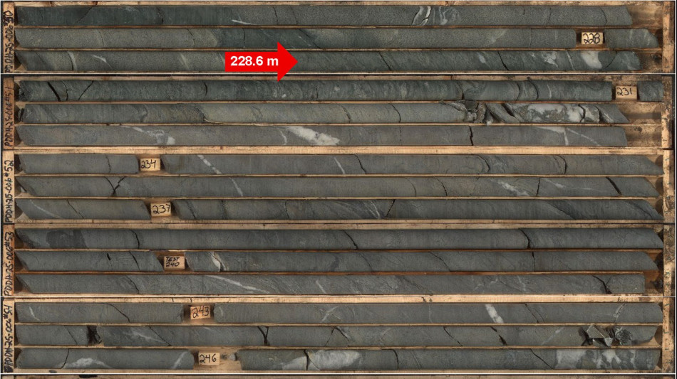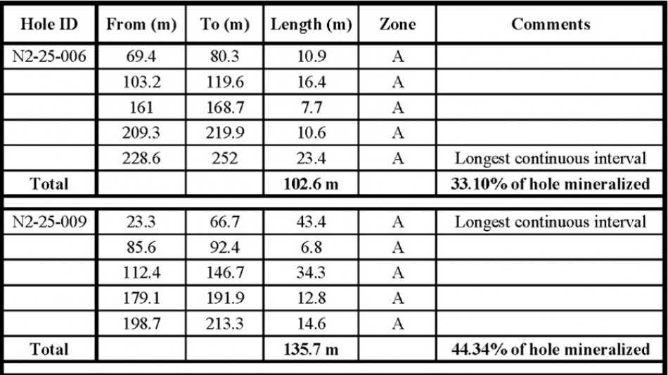 Drillhole N2-25-006: Intercepted 102.6 metres of mineralized section, 33.10% of the 310-metre drillhole.