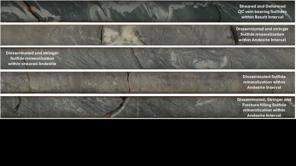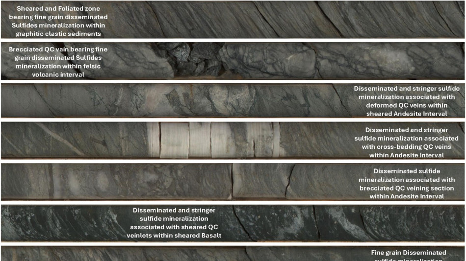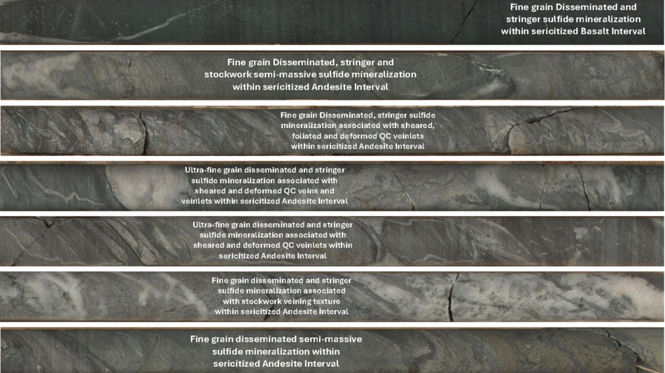 The mineralized sections of N2-25-006 are within the sheared and deformed mafic to intermediate volcanic and less intermediate volcaniclastics and medium grained clastic sediments (sandstone & wacke) rock formations associated with quartz carbonate veins and veinlets (sheared, brecciated and stockwork) and the main alteration products of sericitization and less carbonatization (calcite & ankerite) and silicification dominantly including pyrite, arsenopyrite and less pyrrhotite mineralization in different forms of disseminated, cluster, stringer, semi-massive and fracture filling (Fig. 2).