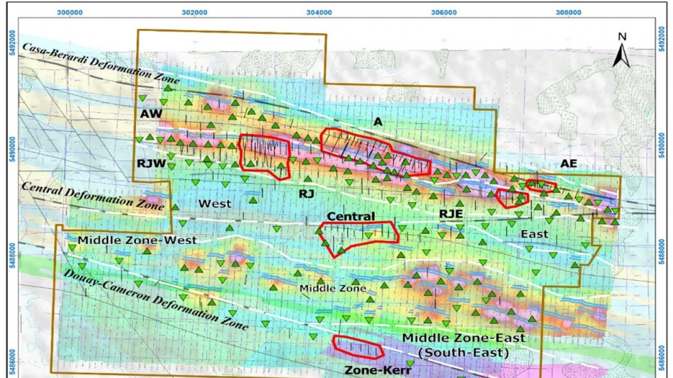 There are six primary auriferous mineralized zones in total, each open for expansion along strike and at depth (Fig. 8). Compilation and geophysical work by Balmoral Resources Ltd. (now Wallbridge Mining) from 2010 to 2018 generated numerous targets that have not yet been investigated with diamond drilling.
