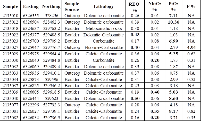 The elevated samples are dominated by carbonatite and carbonatite-related lithologies, with all four (4) boulder samples exceeding 0.20% Nb₂O₅ to a maximum of 0.40% Nb₂O₅ occurring in calcite-rich carbonatite boulders (Table 1, Figure 1). The strongest REO results (>0.25% REO, including the peak value 0.50%) are hosted within dolomitic carbonatite and carbonatite-altered units (Table 1). Additional elevated samples occur in calcite-carbonatite, fluorine-carbonatite, and metasomatic (fenite-style) rocks, supporting the interpretation of a multi-phase intrusive system with both carbonatite and alteration-related REE enrichment. Several of the carbonatite samples also exhibit high-grade phosphate, with seven (7) samples exceeding 5.0% P₂O₅ with a peak value of 10.36% P₂O₅, alongside notably enriched fluorine, including one sample assaying 4.94% F (Table 1). These signatures are fully consistent with apatite- and fluorite-bearing phases typically associated with REE mineralization in carbonatite systems.