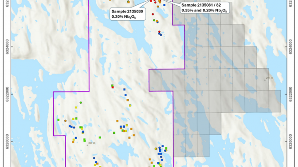Four (4) boulder grab samples returned >0.20% Nb₂O₅, with values up to 0.40% Nb₂O₅.