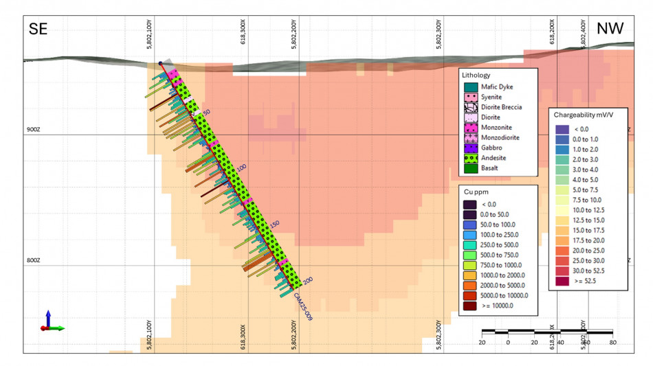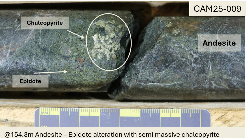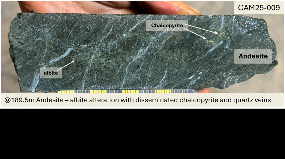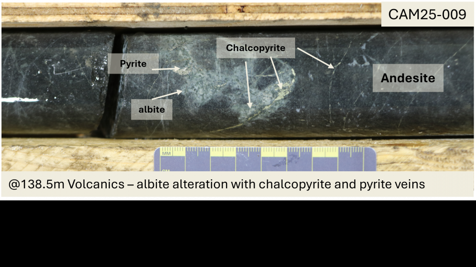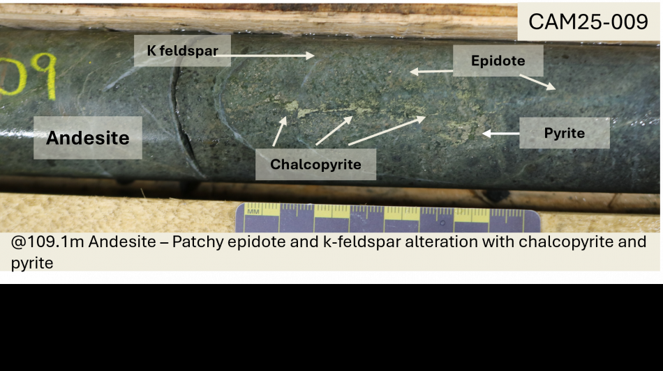 CAM25-008 intersected moderate to strong K-feldspar-biotite-chlorite altered monzodiorite and diorite intruding andesite and hosting 0.5-5% disseminated fine grained pyrite and trace fine grained chalcopyrite.
