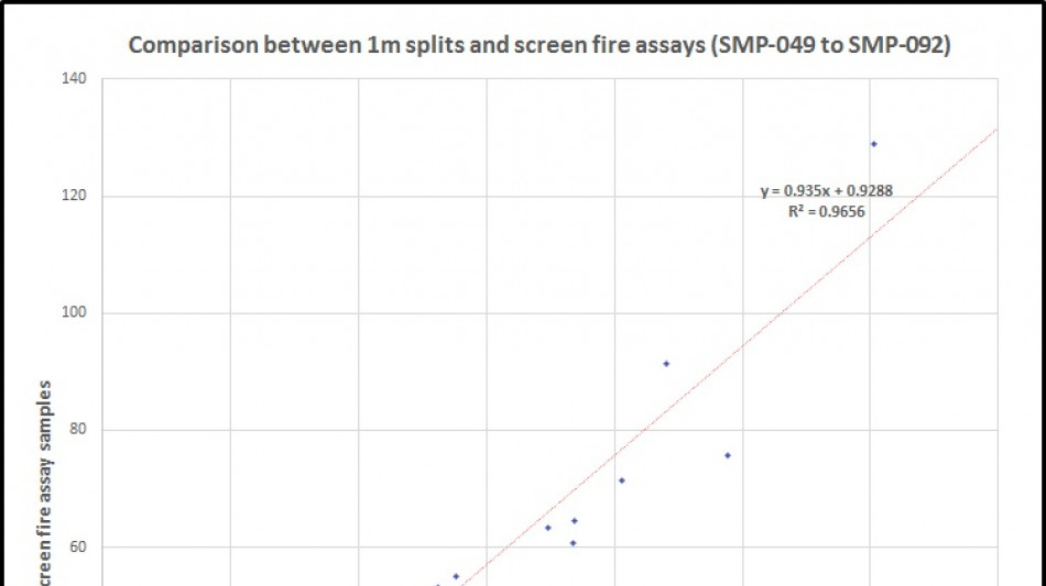 Analysis of the assay data continues to shows a generally very close correlation between the 1m split sample intersections and the 4m composite sample intersections, with the trendline showing a 97% correlation between the 2 sets of samples for the entire phase 3a RC drill programme (holes SMP-049 to SMP-092, Figure 6). This very close and accurate correlation indicates the validity of the sampling methodologies employed, as well as the accuracy of the assays received from both the initial 4m composite samples and the subsequent 1m split samples.