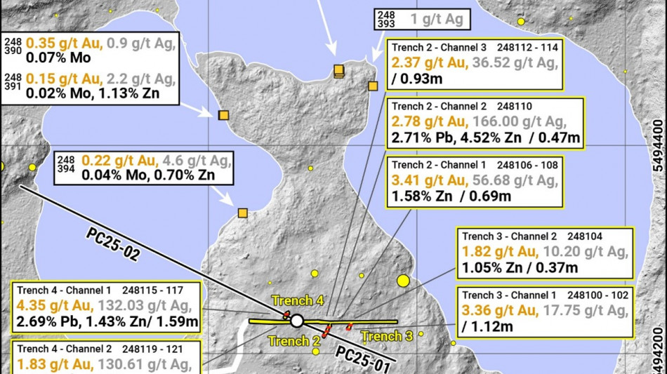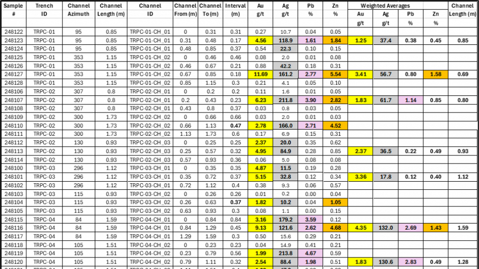 4.35g/t gold and 132.03 g/t silver over 1.59m (TRPC-04)