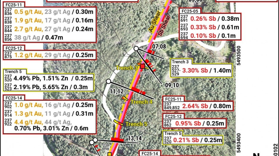 9.6% Sb over 0.65m, within a broader interval of 6.25% Sb over 1.0m in hole FC25-14.