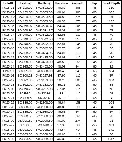 Table 4 - Frost Cove Drillhole Collar Information