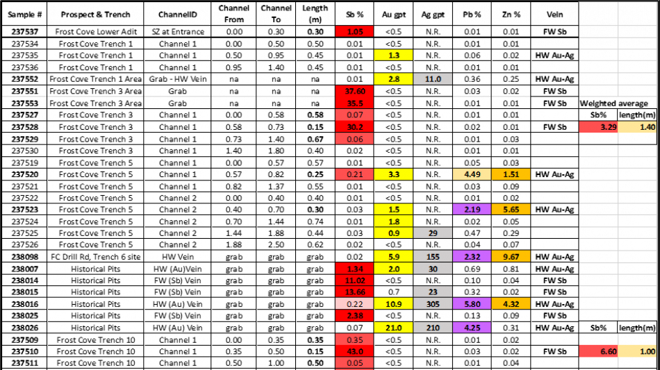 Exceptional, high-grade antimony assays from at Frost Cove Mine (Figs. 1& 2).