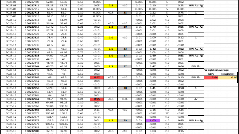 6.97% Sb over 0.30m, within 2.64% Sb over 0.8m in hole FC25-11