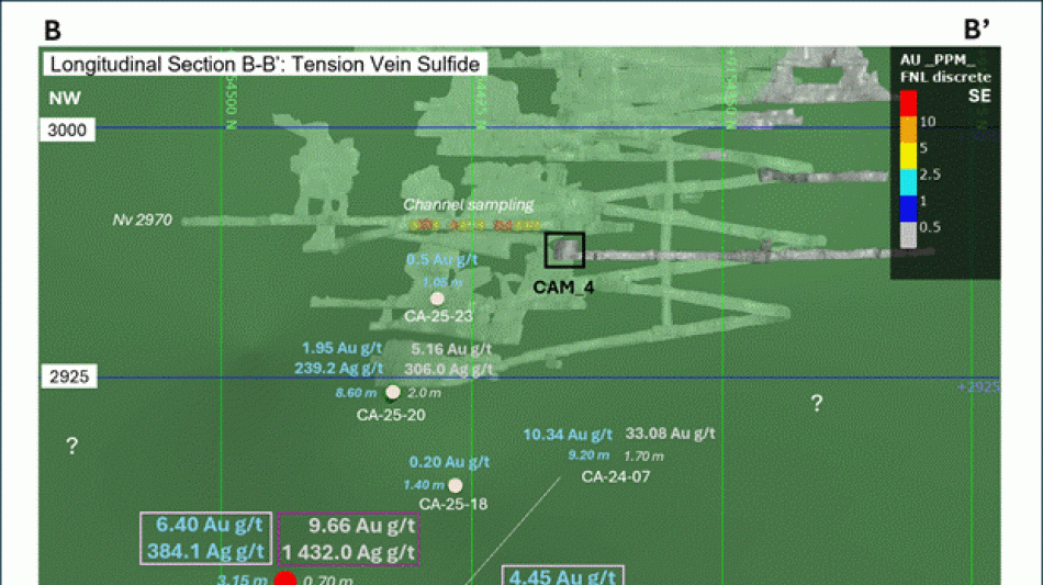 The Drill hole CA-25-28 intersected the mineralized zone grading 6.40 g/t Au and 384.1 g/t Ag over 3.15 meters and it includes a grade of 9.66 g/t Au and 1432.0 g/t Ag over 0.70 meters, occurs within the tension vein (mixed mineralized zone).