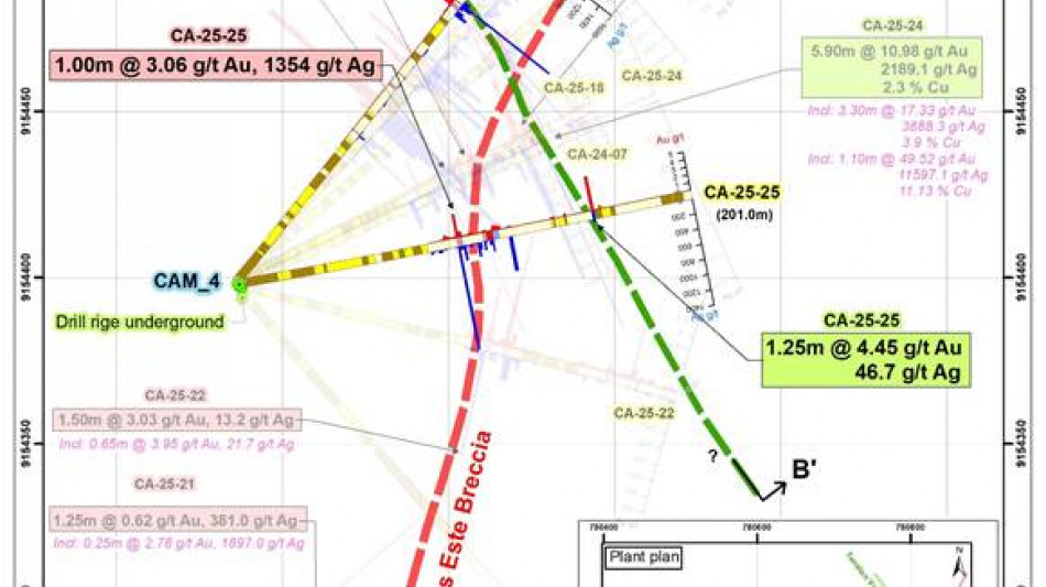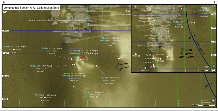 The drillhole CA-25-25 intercepted the Callanquitas East structure and Tension Vein sulfide zone, located 30 meters south and 20 meters above the point 07 (Callanquitas East); and 25 meters south of 07 (Tension Vein sulfide). The intersection grades 1.18 g/t Au and 458.8 g/t Ag over 3.6 meters in Callanquitas East (mixed mineralized zone, goethite - limonite and pyrite). It also intercepted mineralization in the tension vein (sulfide) and grades 4.40 g/t Au and 46.7 g/t Ag over 1.25 meters. The drill hole CA-25-24, the last section of mineralization consists of oxides grading 2.69 g/t Au and 10.2 g/t Ag over 2.90 meters and includes a grade of 4.69 g/t Au and 15.6 g/t Ag over 0.70 meters (oxide zone).