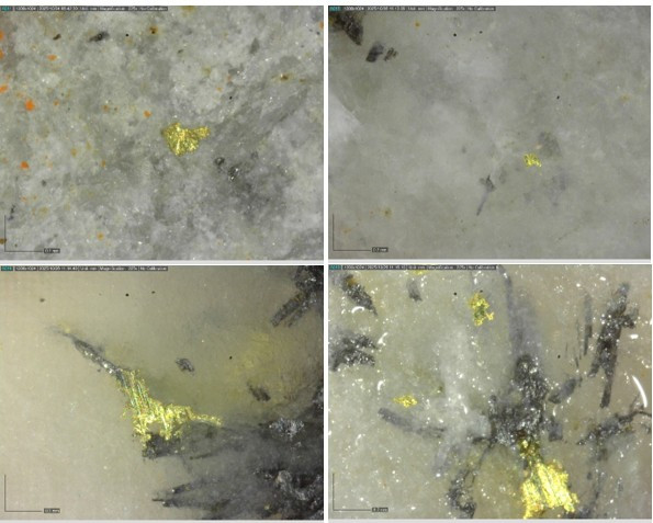 High-grade mineralization in discordant sheeted quartz veins in AX-25-803 in the core of Powerline reinforces continuity and confidence in the new mineralized domain model for the Aurmac deposit (Figure 6). High-grade visible gold mineralization is associated with intergrowths of Bi-sulphosalts and accessory arsenopyrite (Figures 7 and 8). High vein density in AX-25-803 (figure 7) is associated with higher-grade Au mineralization throughout Powerline.