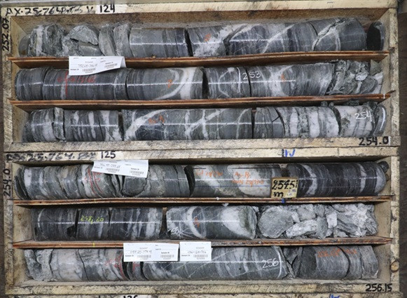 High vein density and Bi-sulphosalts are associated with gold mineralization in southwest Powerline in AX-25-764 (Figure 9 and 10). Potential down-dip extensions of mineralized domains intersected in AX-25-764 remain open at depth as previous drilling did not extend deep enough to test these domains. Step out drilling in AX-25-769 and AX-25-772 intersected local high-grade gold mineralization associated with coarse Bi-Sb-Sulphosalts and large discordant quartz vein, warranting further exploration.