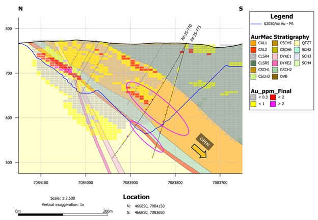 AX-25-773 - 1.90 g/t over 31.2m within 1.10 g/t Au over 66.6m, including high-grade of 3.79 g/t Au over 7.6m, and 0.95 g/t Au over 29.6m, with high-grade intervals of 3.64 g/t au over 6.7m and 4.37 g/t Au over 5.2m;