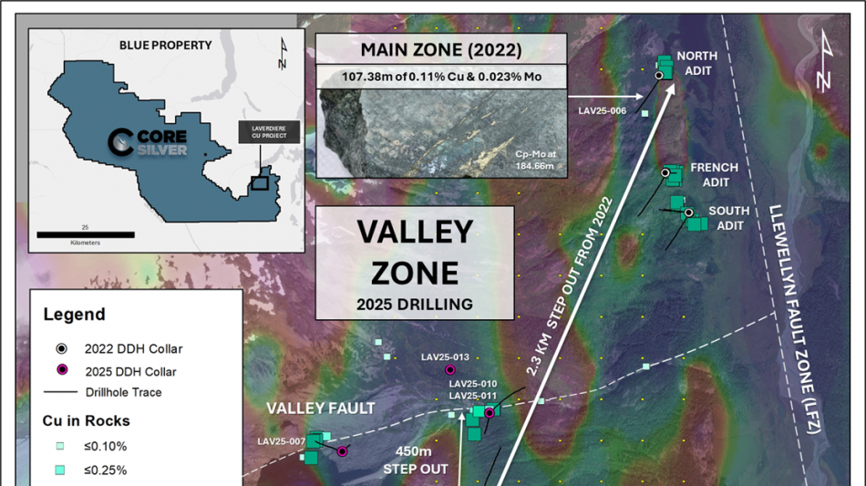 Adits driven into the Laverdiere area in the early 1900s reportedly returned up to 27m grading 1.20% Cu. The Llewellyn Fault Zone, a regional and strongly metal-endowed fault, cuts through the Laverdiere Copper Project for 14km of strike length and marks the contact between the Yukon-Tanana and Stikine Terranes in the Project area. Historic and shallow diamond drilling completed 125m north of the French Adit in 1974 reportedly returned 175m of 0.27% Cu, including 6m of 1.60% Cu and 7.8m of 1.60% Cu. Core Silver's inaugural diamond drilling campaign at the Laverdiere Copper Project in 2022 returned up to 48.5m of 0.90% Cu, 6g/t Ag, and 0.11g/t Au from 31.46m depth in drill hole LAV22-001 (French Adit), 223m of 0.11% Cu, 2g/t Ag, and 0.006% Mo from 15m depth in LAV22-002 (French Adit), and 107.38m of 0.11% Cu, 0.023% Mo, 0.9g/t Ag, and 0.02g/t Au from 144.62m depth in hole LAV22-006 (North Adit).