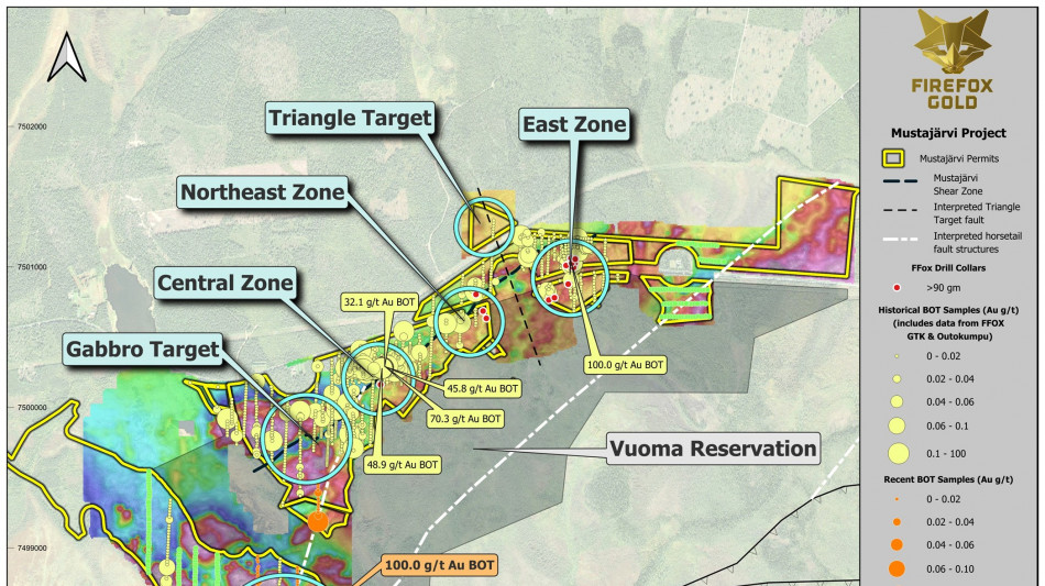 Carl Löfberg, FireFox's CEO, commented "As our 10,000+ metre drill campaign continues at Mustajärvi, these new targets, which are in some cases kilometres away from any previous drilling, continue to show the potential large scale of the system. The latest high gold BoT sample (> 100 g/t) at Mustajärvi West is one of the highest-grade surface samples we have seen, but the East Zone discovery also yielded similarly high gold in BoT samples. Having high gold in till sampling so close to a major interpreted structural intersection makes this target particularly exciting. We will be testing this new target in the current phase of drilling. After confirming the efficacy of our approach to electrical geophysics with recent high-grade drill intercepts, we also look forward to drill testing the latest geophysical anomalies, which are well to the east of any previous drilling."