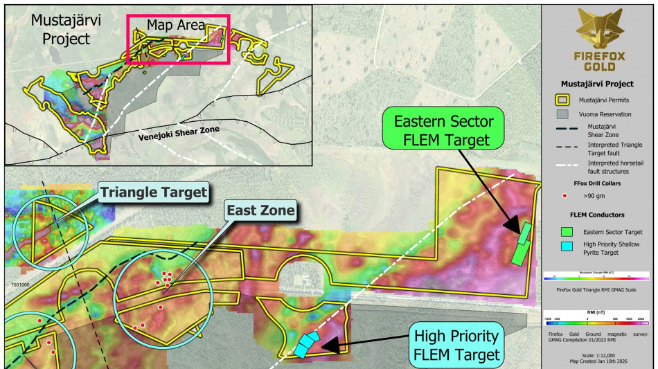 SODANKYLÄ, FINLAND / ACCESS Newswire / January 12, 2026 / FireFox Gold Corp. (TSX.V:FFOX)(OTCQB:FFOXF)("FireFox" or the "Company") is pleased to share an exploration update from its 100%-held Mustajärvi Gold Project in Lapland, Finland. New drill targets have emerged well away from previously reported high-grade drill results in the Northeast and East Zones. The new targets are based on new gold anomalies in base-of-till (BoT) sampling and geophysical anomalies, both of which correlate with attractive structural settings and other favourable indicators. Perhaps most significant, one new BoT sample returned more than 100 g/t gold in an undrilled area near a major structural intersection two kilometres southwest from any previous drilling. FireFox will be targeting this area and the new geophysical anomalies with new drilling as part of its ongoing Mustajärvi drill program.