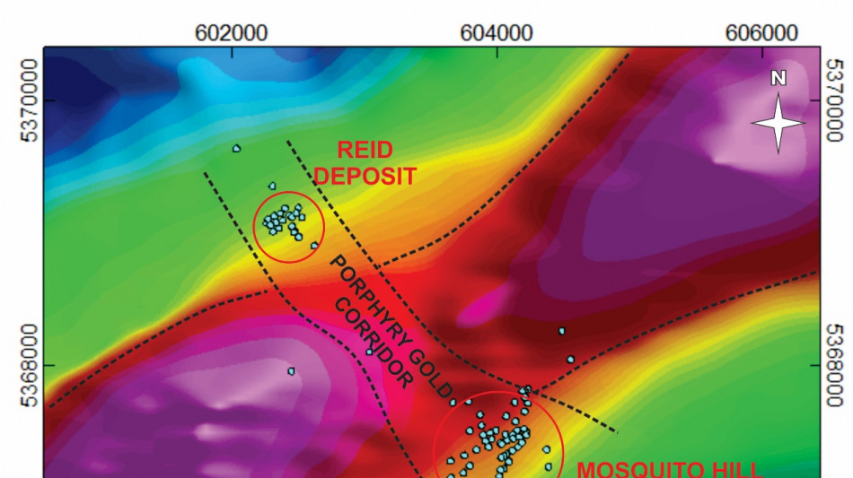 Current work by the Company on the historical data compilation at the Mosquito Hill and Reid Deposits indicates that both deposits are within a "Porphyry Gold Corridor" and are spatially related and developed within the same broader deep-seated and laterally extensive magmatic-hydrothermal system (see Map 2 below). The three-kilometre-long corridor hosts both porphyry-controlled gold deposits, additional untested porphyry gold targets, alteration and mineralization. It represents a separate, larger porphyry-controlled gold environment at Gold Anchor than previously recognized. This corridor is a priority one target area for establishing a mineral resource at both the Mosquito Hill and Reid Deposits, and for additional discovery opportunities at untested porphyry targets within the corridor.